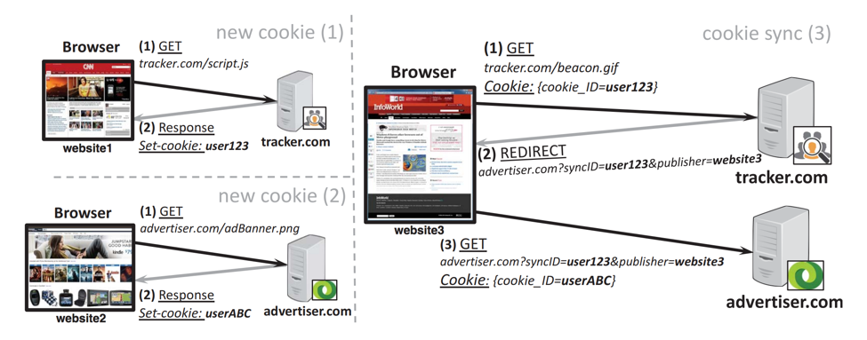 - Private data that can leak with cookie synchronization: name, gender, age, date of birth, physical/email address, location, username and password, phone number, etc.